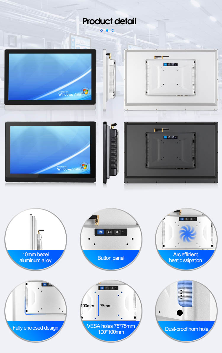This 21.5-inch LED industrial all-in-one touch panel pc with a 10mm front bezel, is suitable for use in harsh industrial environments with good impact resistance. The true flat panel is well-embedded in cabinets, a power distribution box, and a control table. Single-point resistive touch screen with default IP65 (front panel). Typical 1920*1080 resolution. Compact fanless design for heat-dissipation, fully functional, all the power and functionality of a desktop computer in all in one design, powered by Intel processor, ideal for industrial and commercial applications. It is suitable for multiple applications, and industries such as manufacturing, production lines, security, smart factory workshops, business, finance, and projects.